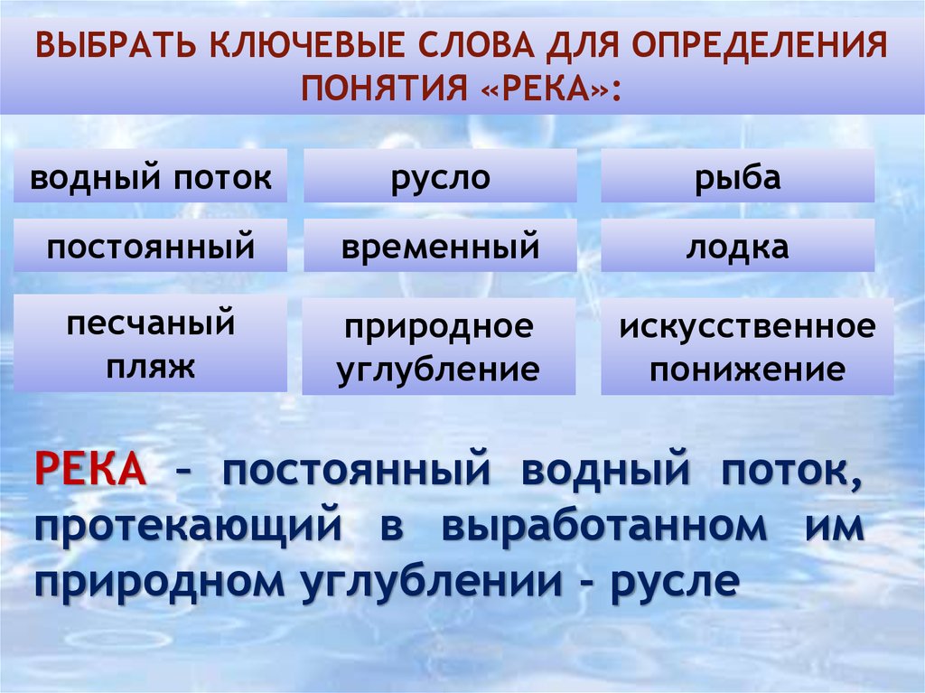 ВЫБРАТЬ КЛЮЧЕВЫЕ СЛОВА ДЛЯ ОПРЕДЕЛЕНИЯПОНЯТИЯ «РЕКА»:
