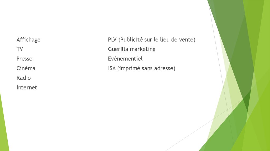 • Guerilla marketing (est un concept de stratégie de publicité conçue pour les petites entreprises