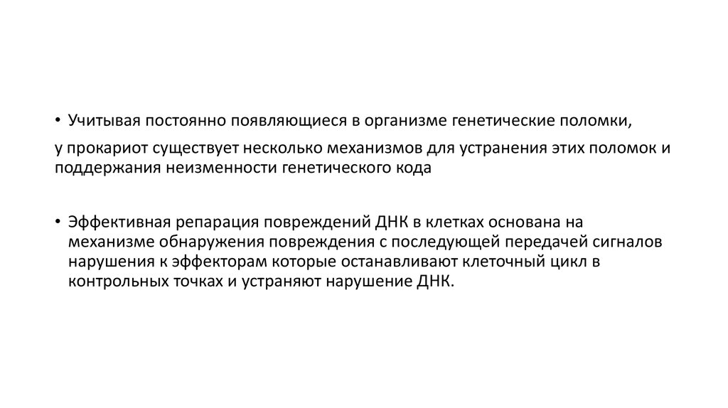 • Учитывая постоянно появляющиеся в организме генетические поломки,у прокариот существует несколько механизмов для устранения этих поломок и