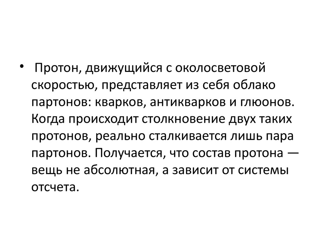 • Дело в том, что утверждение «протон состоит из трех кварков» хорошоработает только для неподвижного или медленно движущегося протона. Если