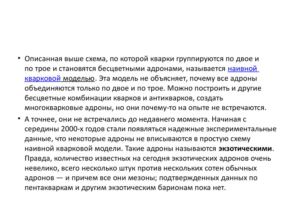 • Описанная выше схема, по которой кварки группируются по двое ипо трое и становятся бесцветными адронами, называется наивной