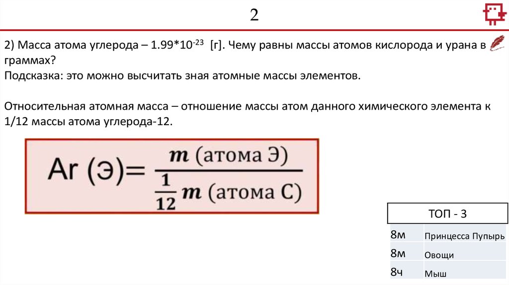 22) Масса атома углерода – 1.99*10-23 [г]. Чему равны массы атомов углерода и тория в