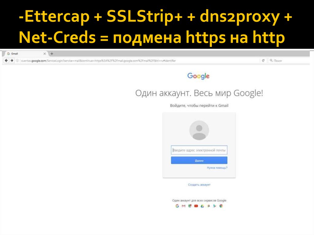 -Ettercap + SSLStrip+ + dns2proxy +Net-Creds = подмена https на http