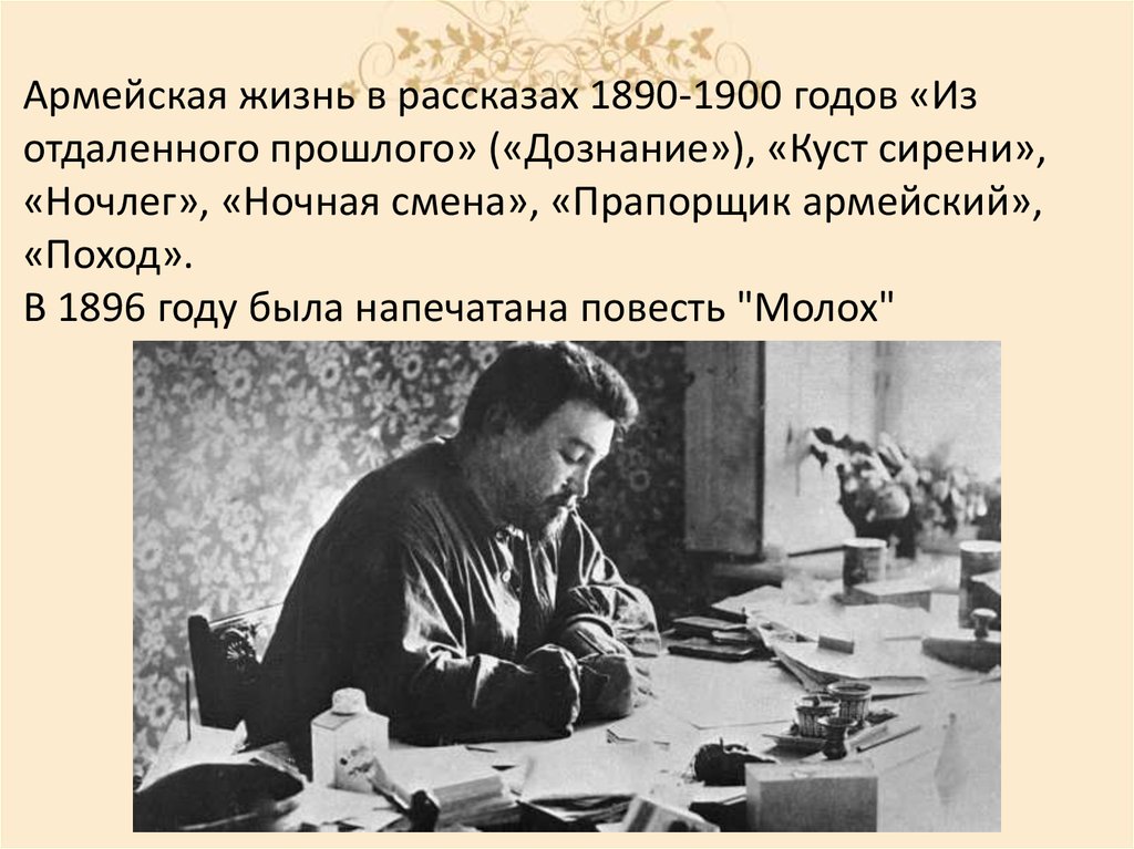 Армейская жизнь в рассказах 1890-1900 годов «Изотдаленного прошлого» («Дознание»), «Куст сирени»,