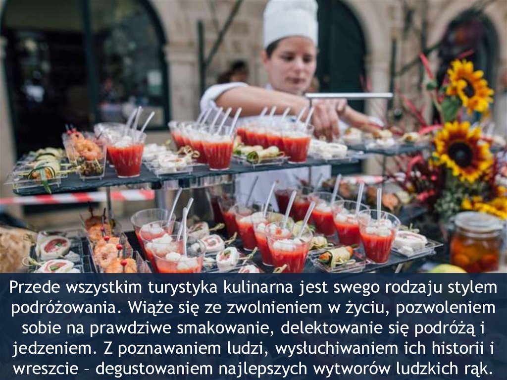 Przede wszystkim turystyka kulinarna jest swego rodzaju stylempodróżowania. Wiąże się ze zwolnieniem w życiu, pozwoleniem
