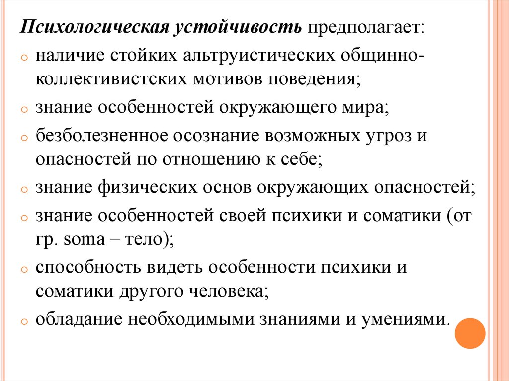 Психологическая устойчивость предполагает:o наличие стойких альтруистических общинноколлективистских мотивов поведения;