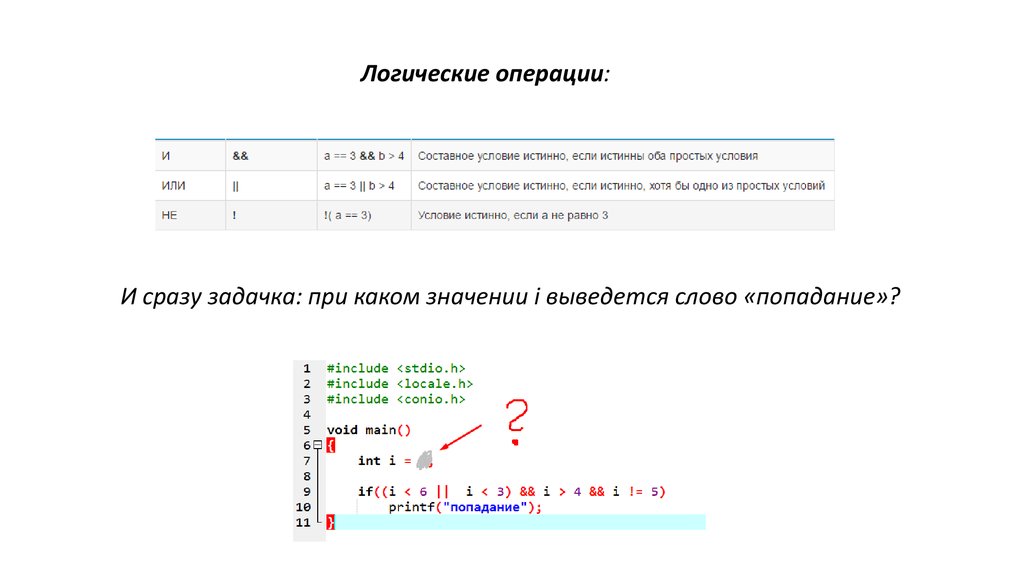 Логические операции:И сразу задачка: при каком значении i выведется слово «попадание»?