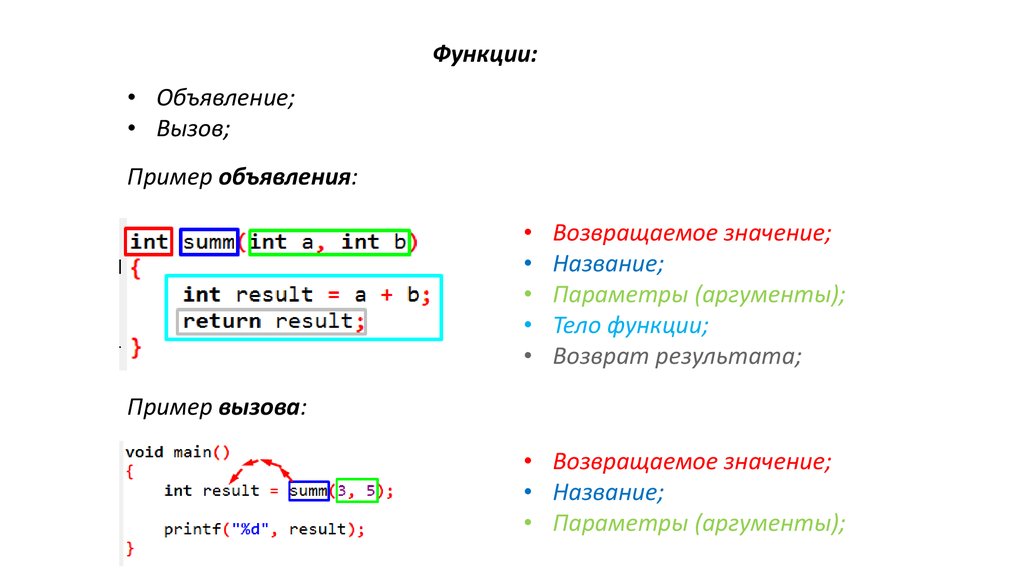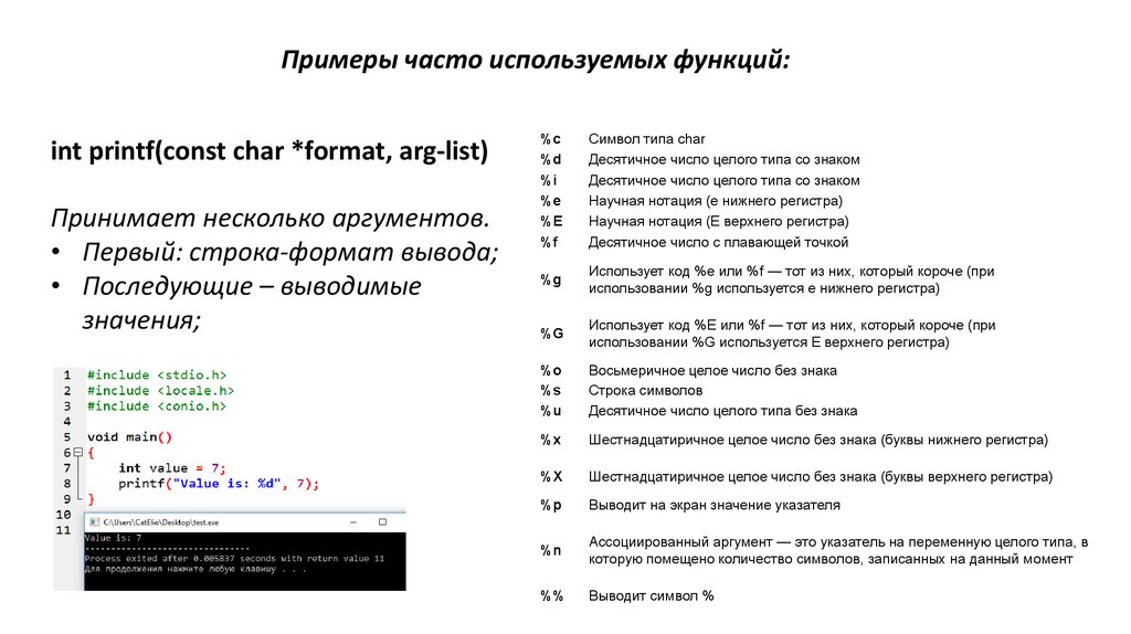 Примеры часто используемых функций:int printf(const char *format, arg-list)