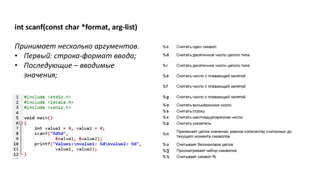 int scanf(const char *format, arg-list)Принимает несколько аргументов.