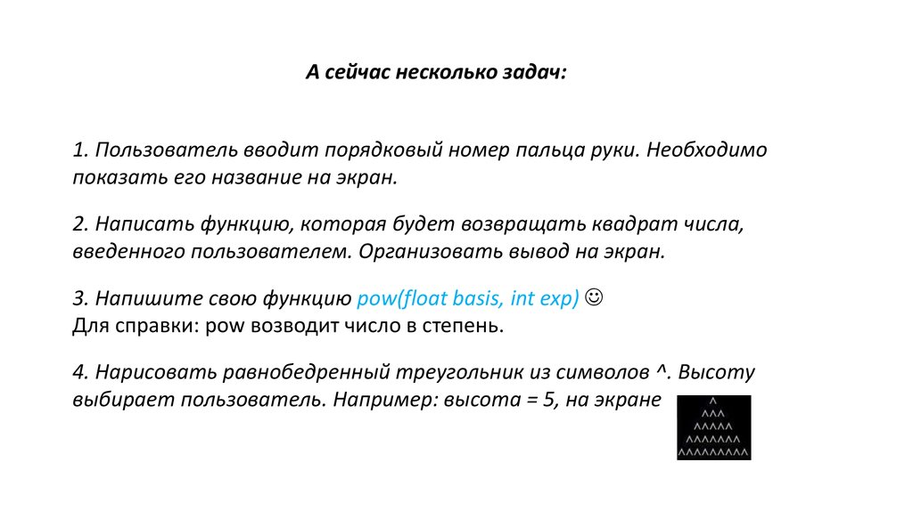 А сейчас несколько задач:1. Пользователь вводит порядковый номер пальца руки. Необходимо