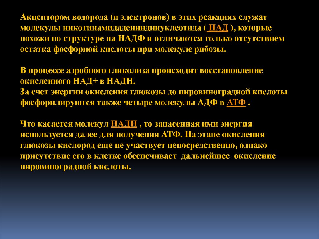 Акцептором водорода (и электронов) в этих реакциях служатмолекулы никотинамидадениндинуклеотида ( НАД ), которые