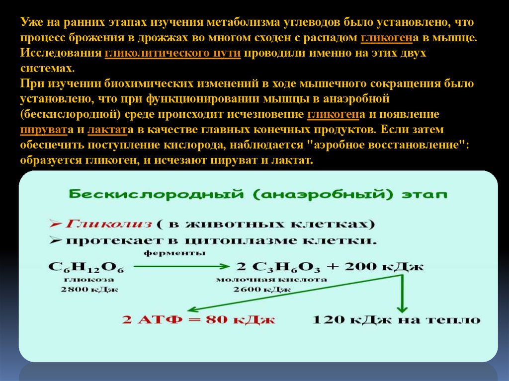 Уже на ранних этапах изучения метаболизма углеводов было установлено, чтопроцесс брожения в дрожжах во многом сходен с распадом гликогена в мышце.