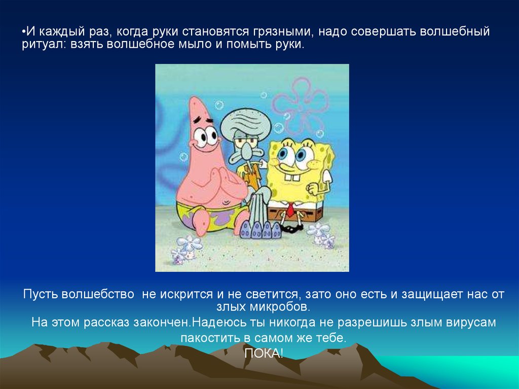 •И каждый раз, когда руки становятся грязными, надо совершать волшебныйритуал: взять волшебное мыло и помыть руки.