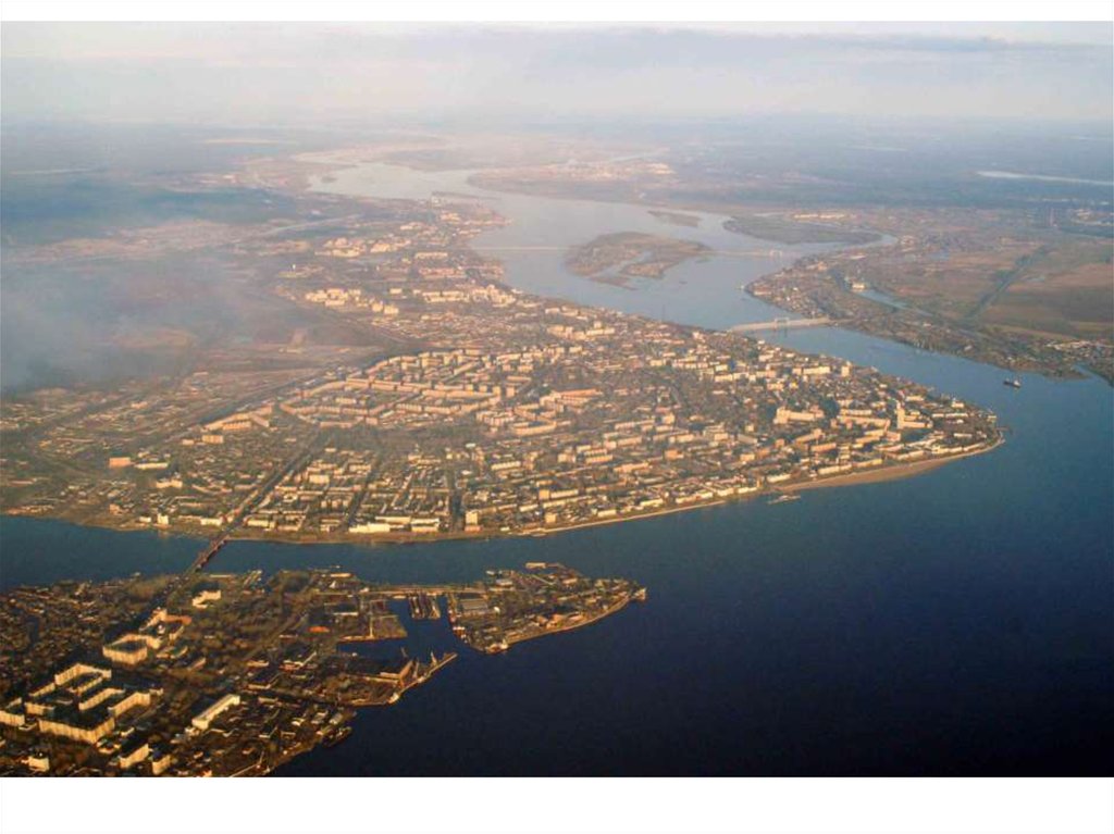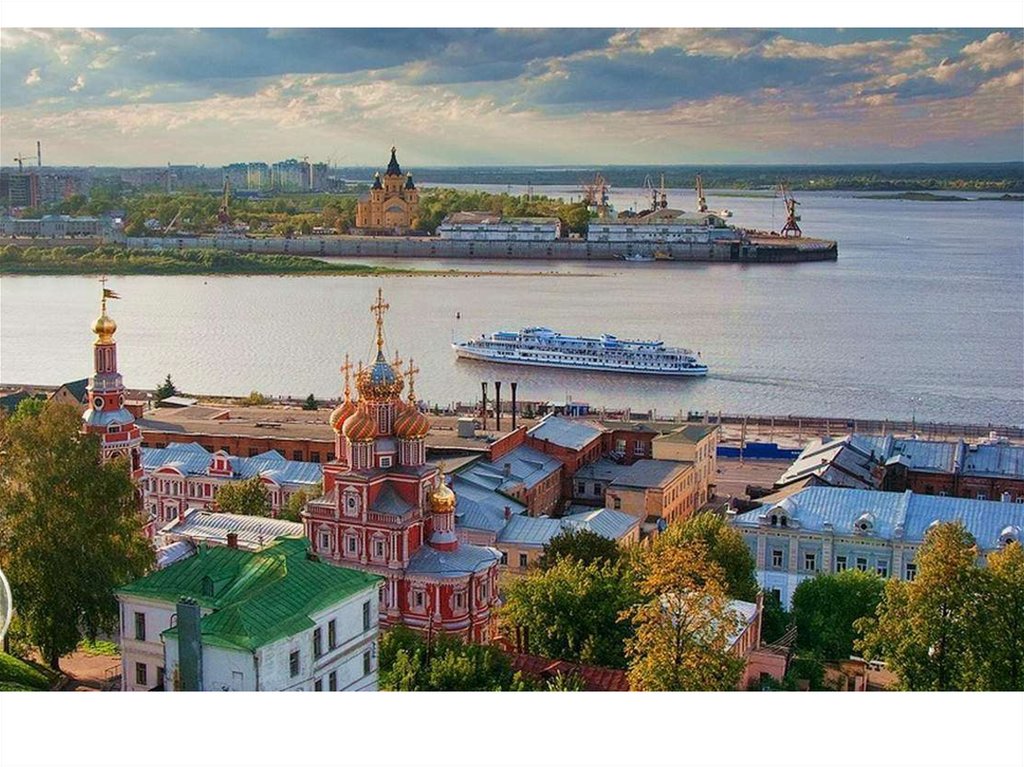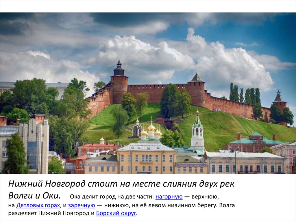 Нижний Новгород стоит на месте слияния двух рекВолги и Оки. Ока делит город на две части: нагорную — верхнюю,