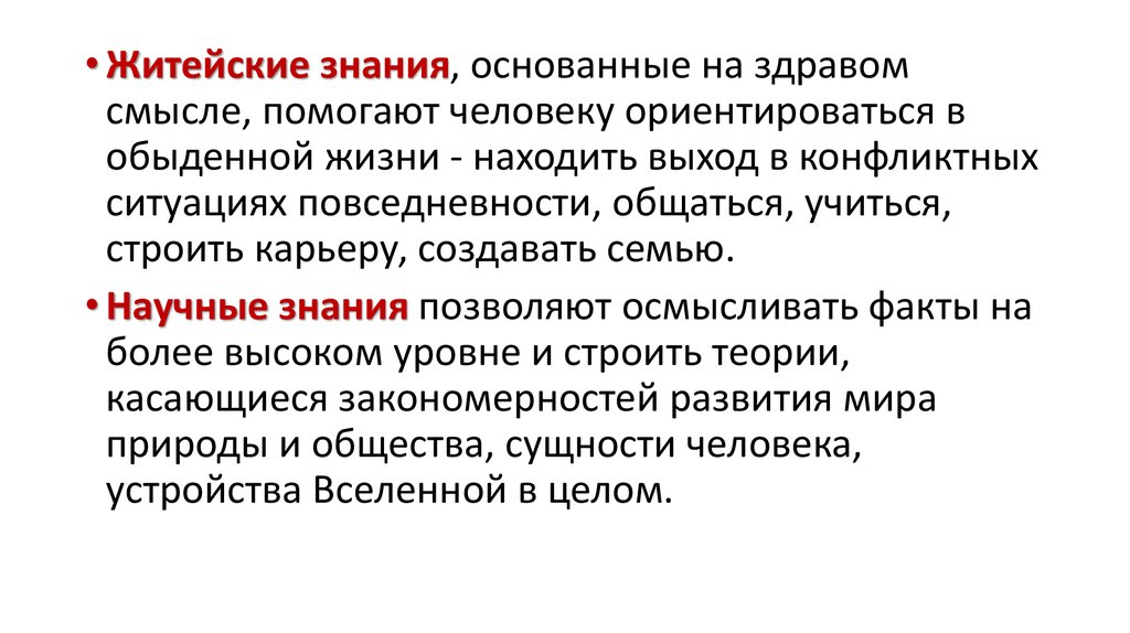 • Житейские знания, основанные на здравомсмысле, помогают человеку ориентироваться в