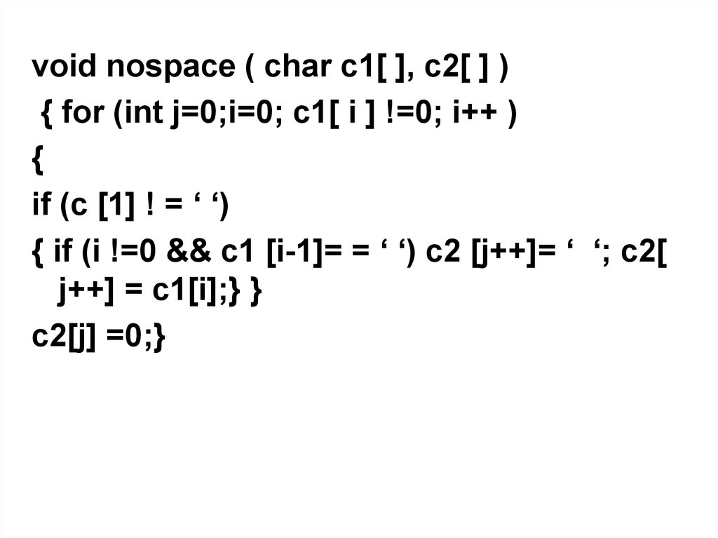 void nospace ( char c1[ ], c2[ ] ){ for (int j=0;i=0; c1[ i ] !=0; i++ )