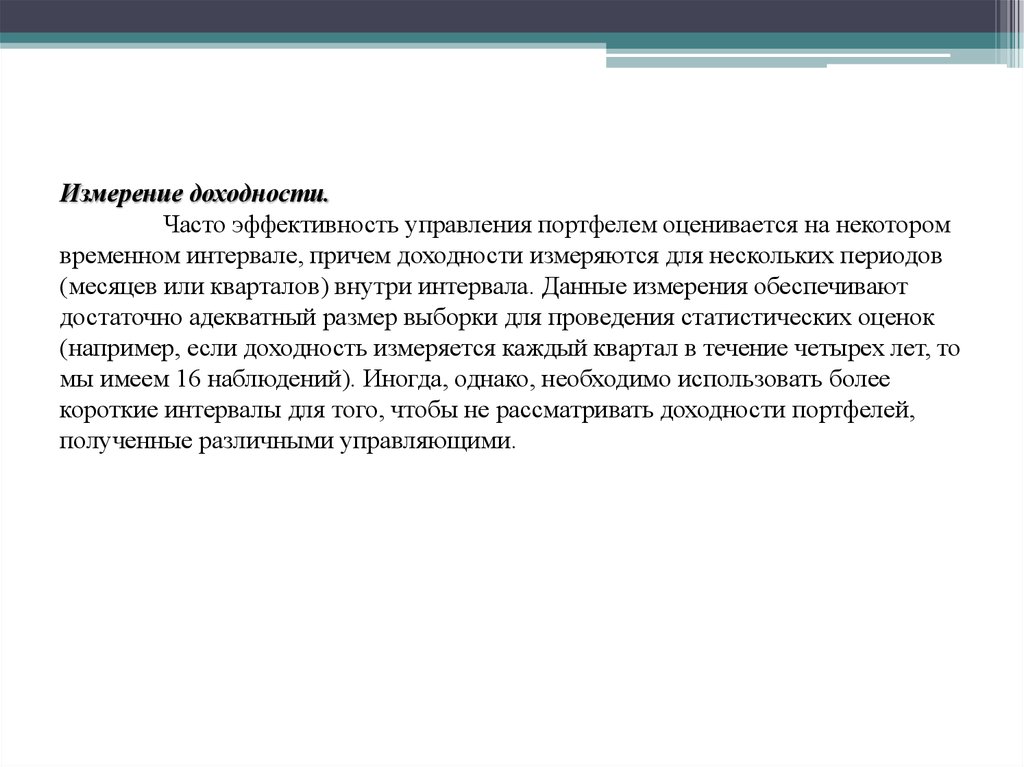 Измерение доходности.Часто эффективность управления портфелем оценивается на некотором