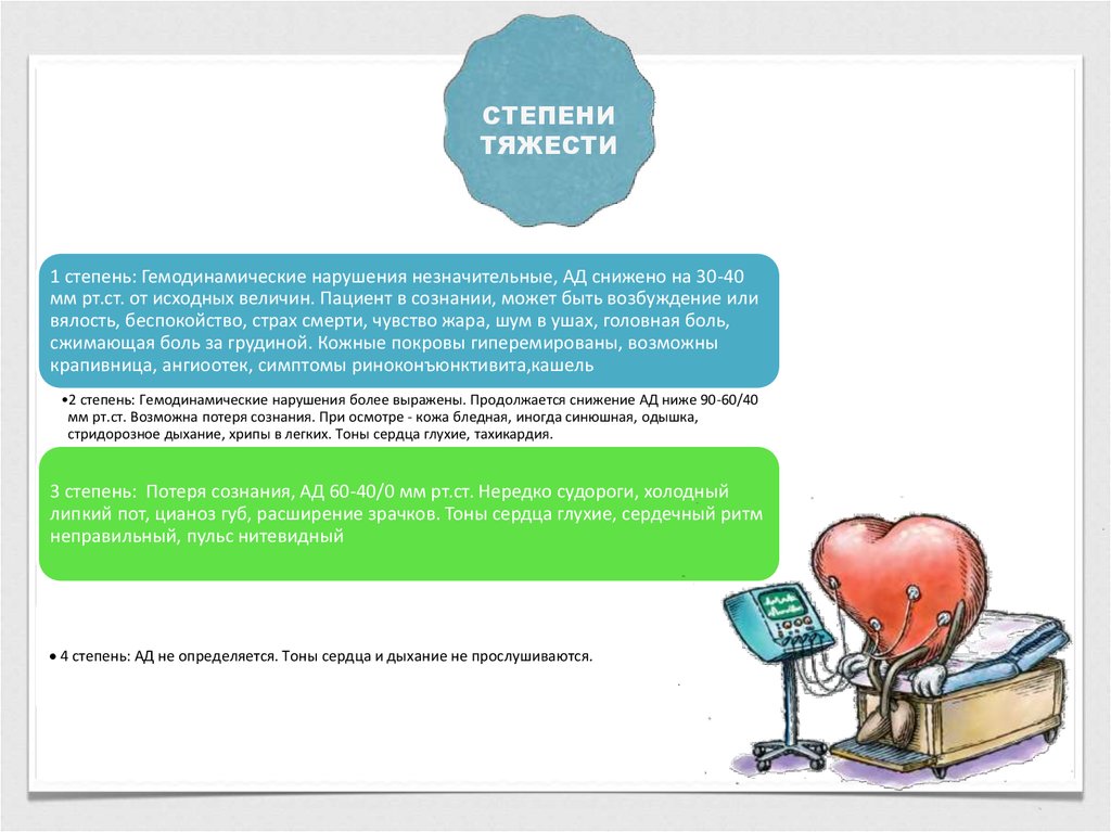 1 степень: Гемодинамические нарушения незначительные, АД снижено на 30-40