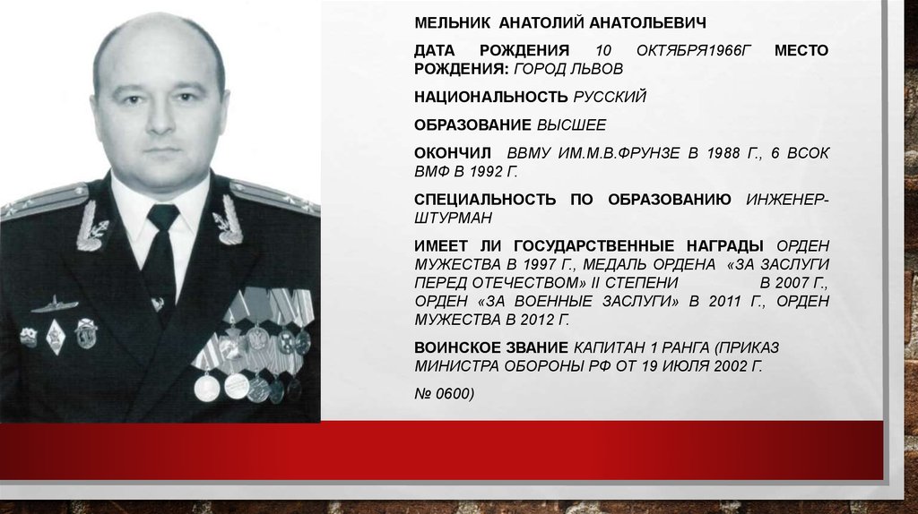 КОМАНДИР АПЛ «ЛОШАРИК»КАПИТАН 1 РАНГА МЕЛЬНИК
