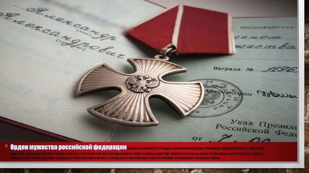 ОРДЕНОМ НАГРАЖДАЮТСЯ ГРАЖДАНЕ РОССИЙСКОЙ ФЕДЕРАЦИИ, ПРОЯВИВШИЕ САМООТВЕРЖЕННОСТЬ, МУЖЕСТВО ИОТВАГУ ПРИ ОХРАНЕ ОБЩЕСТВЕННОГО ПОРЯДКА, В БОРЬБЕ С ПРЕСТУПНОСТЬЮ, ПРИ СПАСЕНИИ ЛЮДЕЙ ВО ВРЕМЯ СТИХИЙНЫХ БЕДСТВИЙ, ПОЖАРОВ, КАТАСТРОФ И ДРУГИХ ЧРЕЗВЫЧАЙНЫХ ОБСТОЯТЕЛЬСТВ, А ТАКЖЕ ЗА