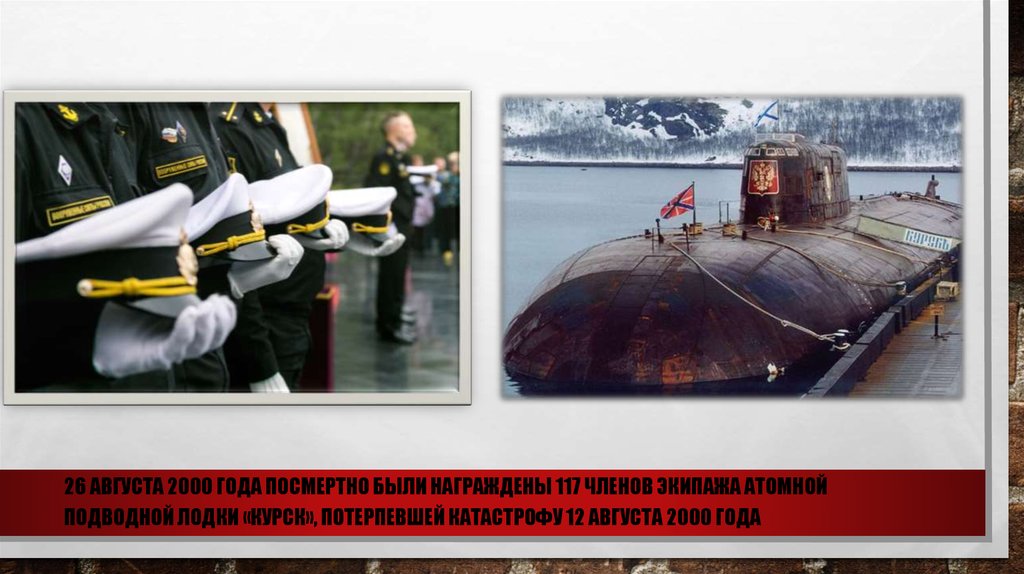 26 АВГУСТА 2000 ГОДА ПОСМЕРТНО БЫЛИ НАГРАЖДЕНЫ 117 ЧЛЕНОВ ЭКИПАЖА АТОМНОЙПОДВОДНОЙ ЛОДКИ «КУРСК», ПОТЕРПЕВШЕЙ КАТАСТРОФУ 12 АВГУСТА 2000 ГОДА