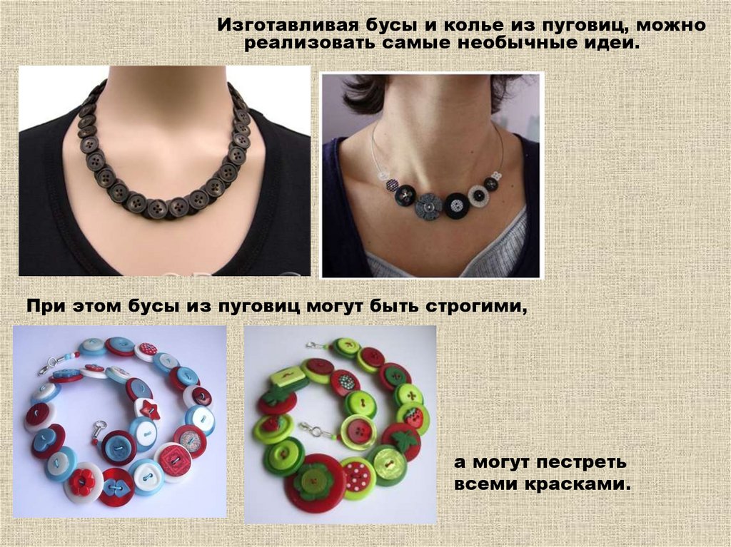Изготавливая бусы и колье из пуговиц, можнореализовать самые необычные идеи.