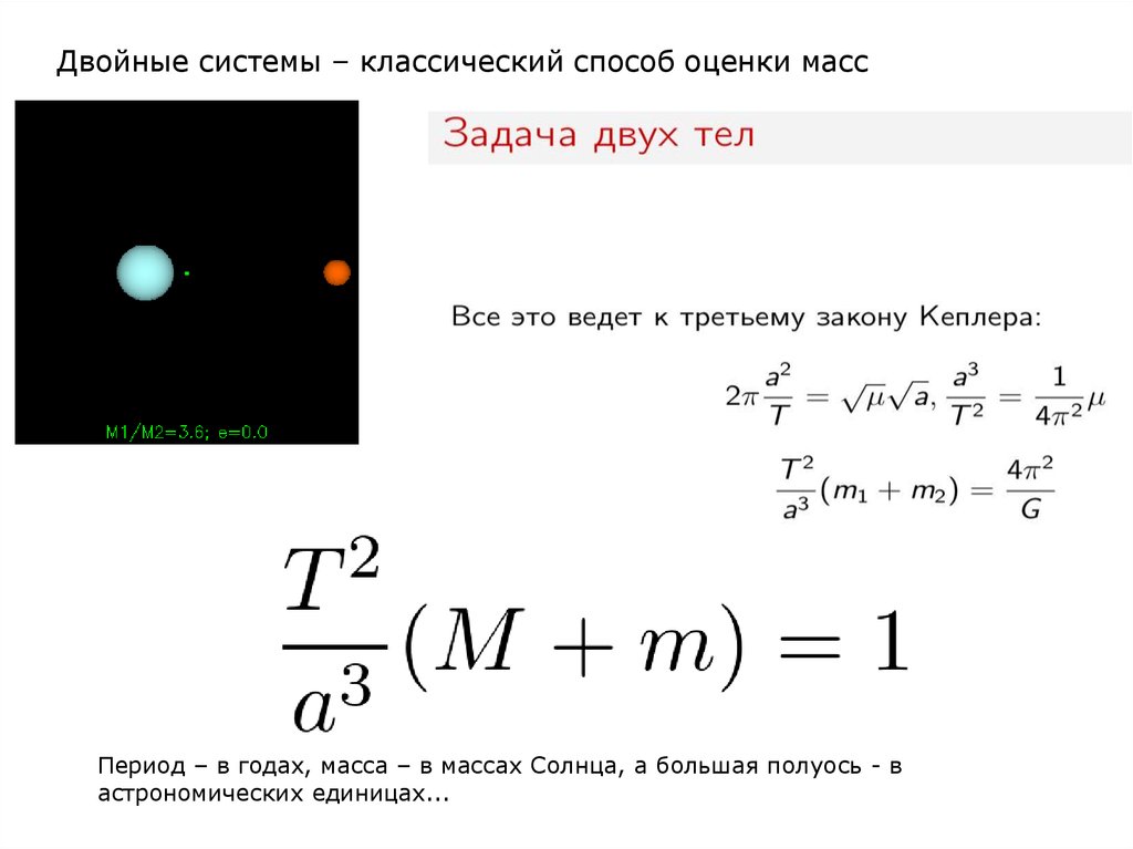 Двойные системы – классический способ оценки массПериод – в годах, масса – в массах Солнца, а большая полуось - в