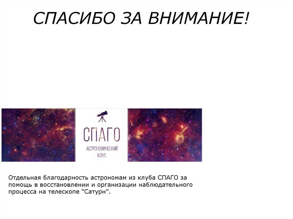 СПАСИБО ЗА ВНИМАНИЕ!Отдельная благодарность астрономам из клуба СПАГО за