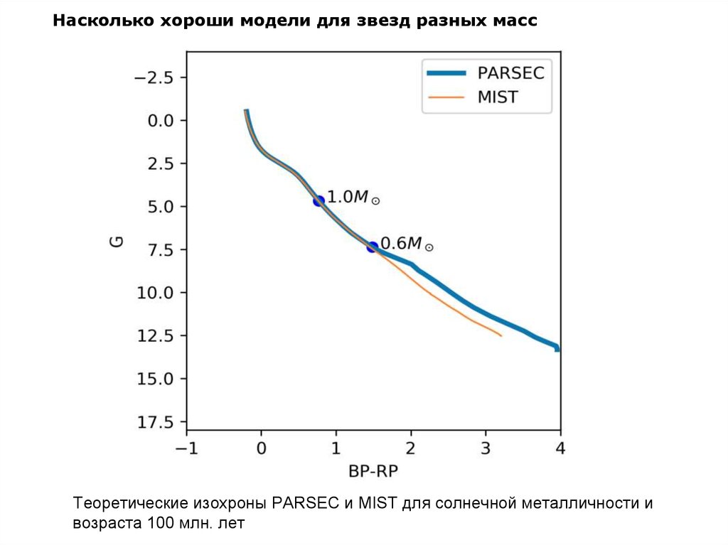 Насколько хороши модели для звезд разных массТеоретические изохроны PARSEC и MIST для солнечной металличности и