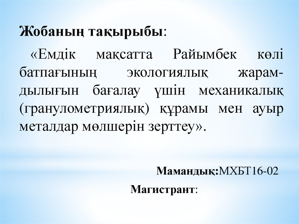 Жобаның тақырыбы:«Емдік мақсатта Райымбек көлі