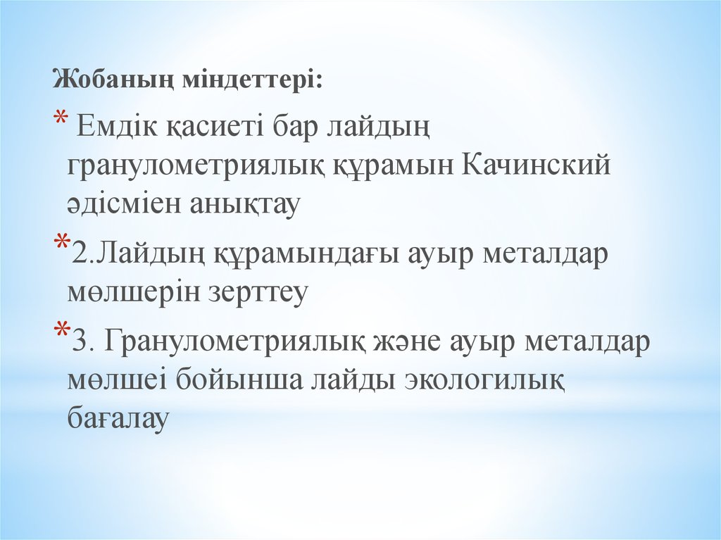 Жобаның міндеттері:* Емдік қасиеті бар лайдың