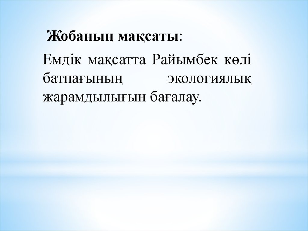Жобаның мақсаты:Емдік мақсатта Райымбек көлі