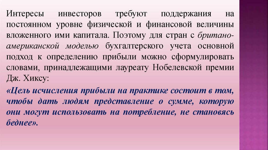 вложенного ими капитала. Поэтому для стран с британоамериканской моделью бухгалтерского учета основной