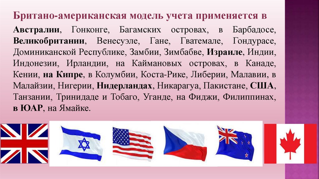 Британо-американская модель учета применяется вАвстралии, Гонконге, Багамских островах, в Барбадосе,