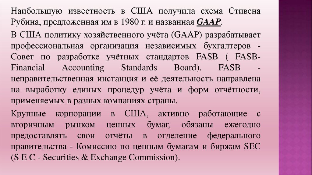 Наибольшую известность в США получила схема СтивенаРубина, предложенная им в 1980 г. и названная GAAP.