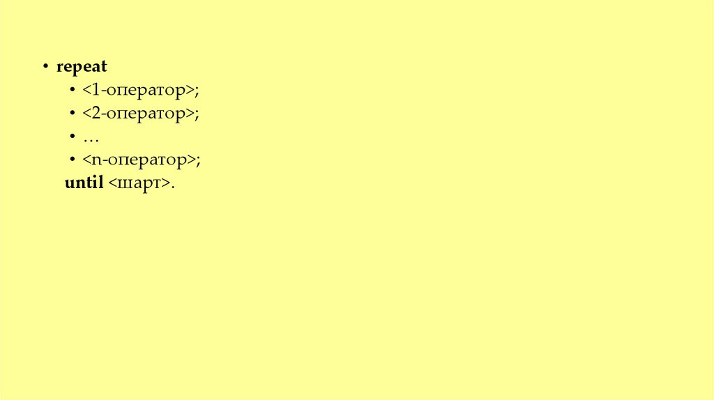 • Pascal тілінде алдын ала қайталау саны белгісіз болса және шарттысоңында тексеру қажет болса, repeat..until.. операторы қолданылады.