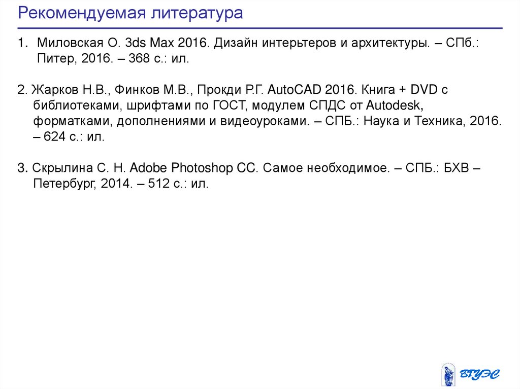Рекомендуемая литература1. Миловская О. 3ds Max 2016. Дизайн интерьтеров и архитектуры. – СПб.:
