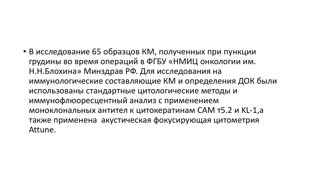• В исследование 65 образцов КМ, полученных при пункциигрудины во время операций в ФГБУ «НМИЦ онкологии им.