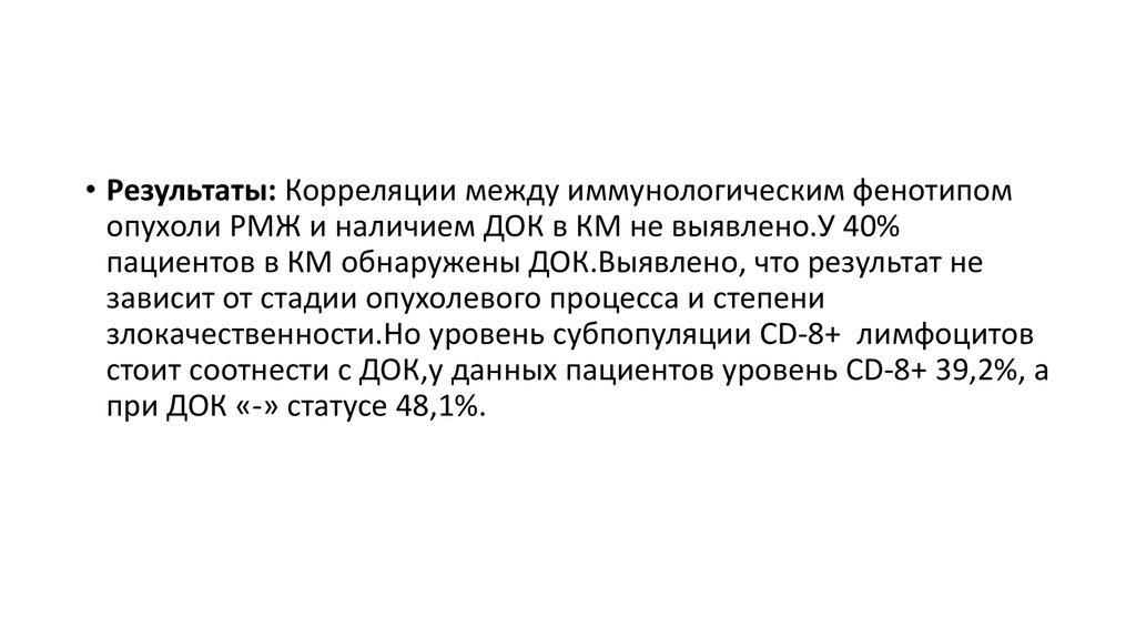 • Результаты: Корреляции между иммунологическим фенотипомопухоли РМЖ и наличием ДОК в КМ не выявлено.У 40%