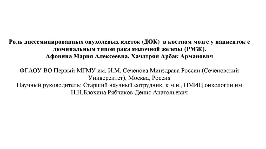 Роль диссеминированных опухолевых клеток (ДОК) в костном мозге у пациенток слюминальным типом рака молочной железы (РМЖ).