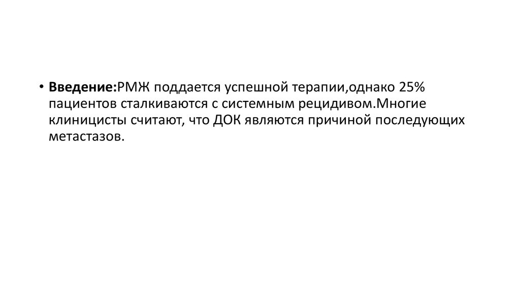 • Введение:РМЖ поддается успешной терапии,однако 25%пациентов сталкиваются с системным рецидивом.Многие