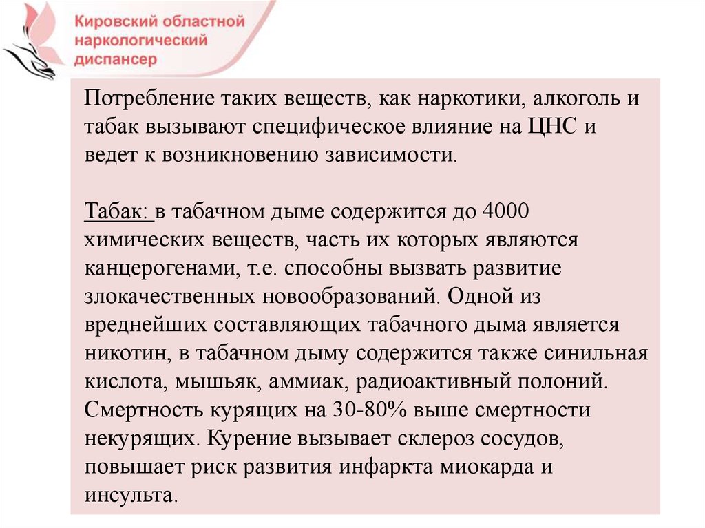 Потребление таких веществ, как наркотики, алкоголь итабак вызывают специфическое влияние на ЦНС и