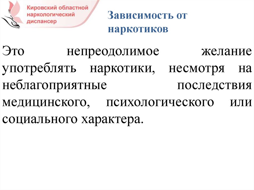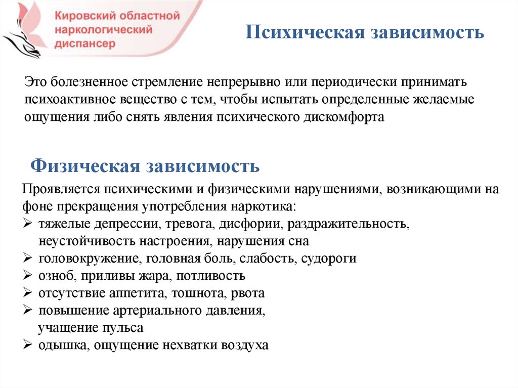 Психическая зависимостьЭто болезненное стремление непрерывно или периодически принимать