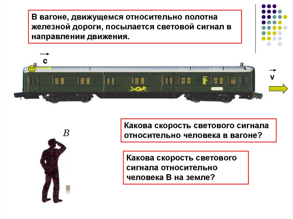В вагоне, движущемся относительно полотнажелезной дороги, посылается световой сигнал в