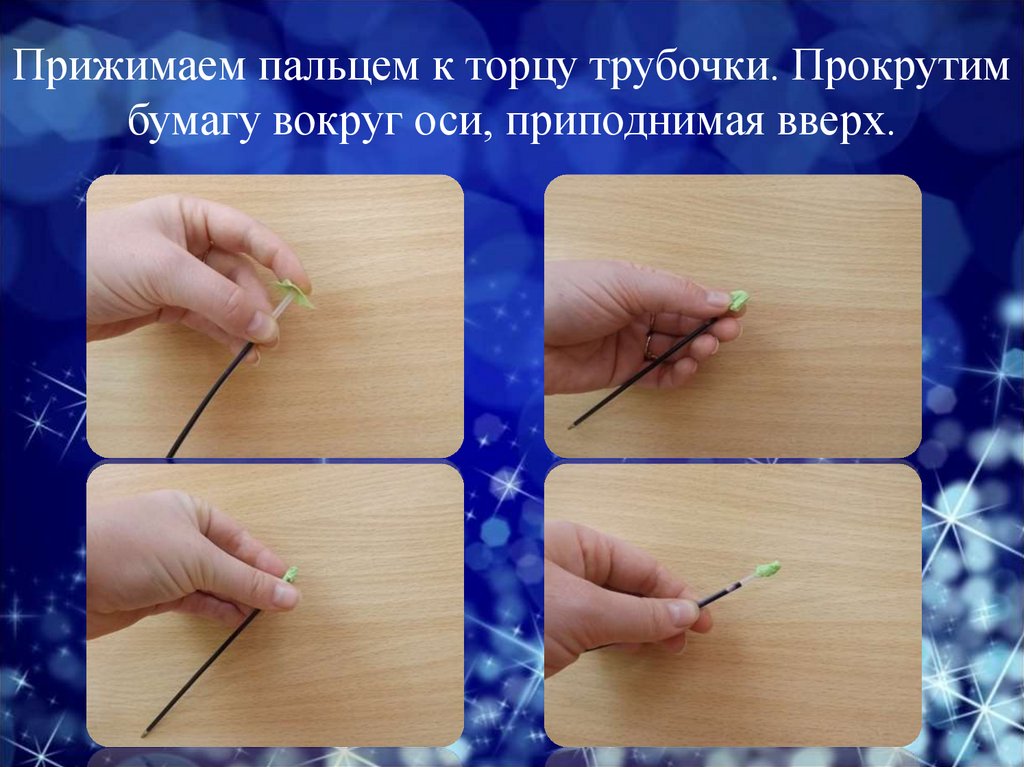 Прижимаем пальцем к торцу трубочки. Прокрутимбумагу вокруг оси, приподнимая вверх.