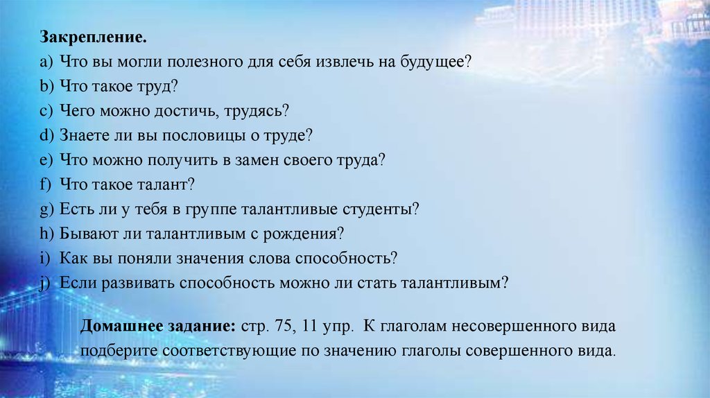 Домашнее задание: стр. 75, 11 упр. К глаголам несовершенного вида