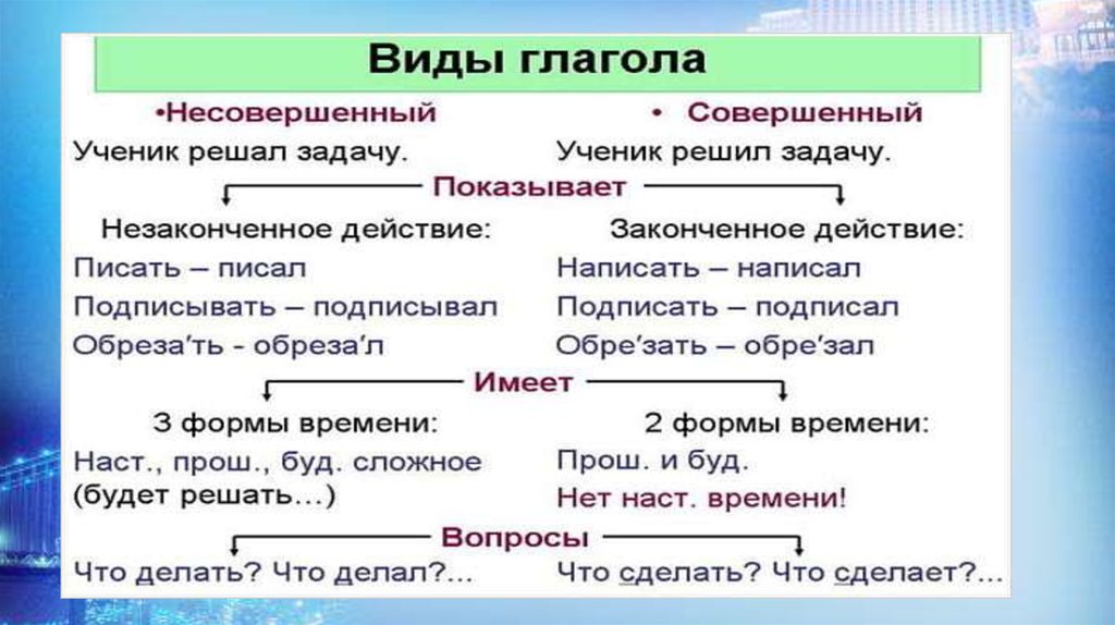 Совершенный и не совершенный вид глагола.