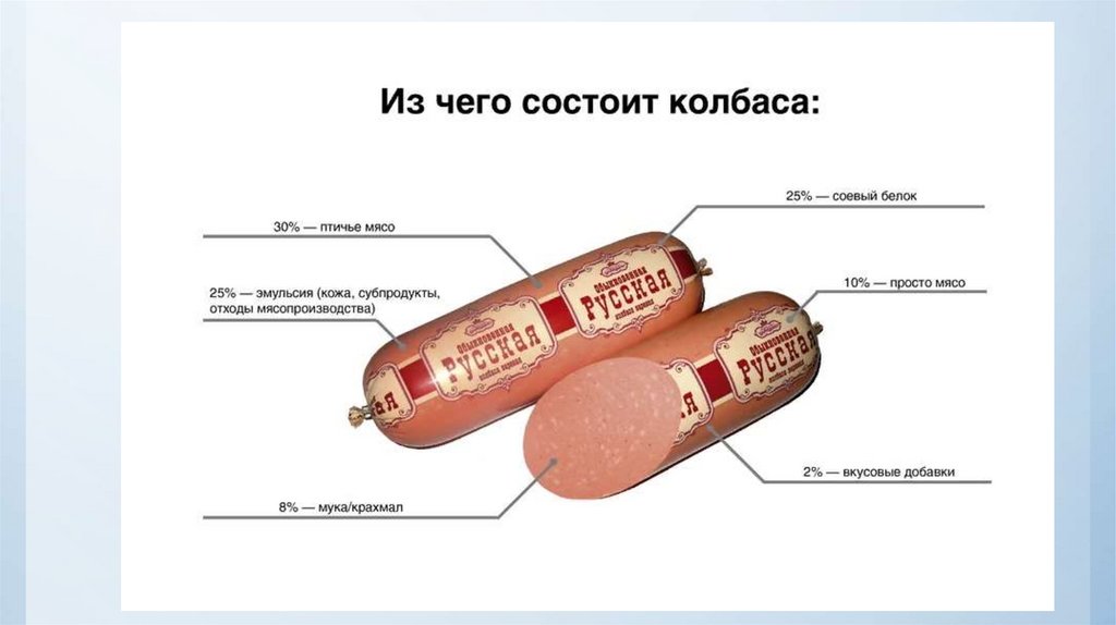 • Установили практическим путем, что чем дешевле колбаса, тем больше в ней растительного белка,