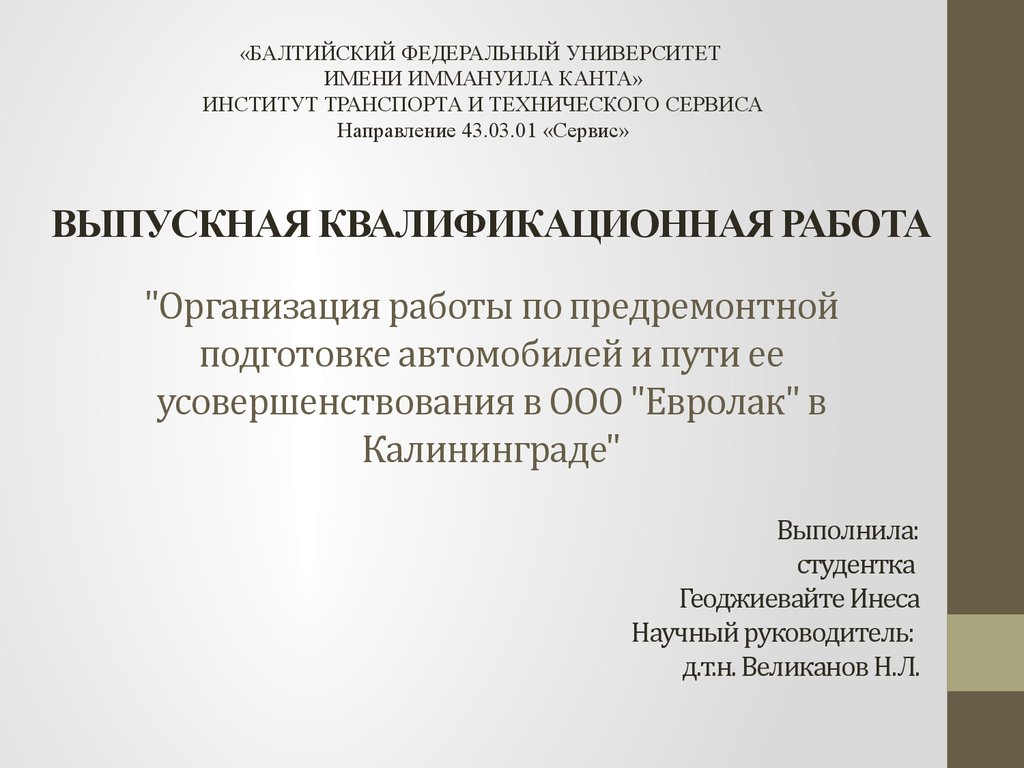 1. ВЫПУСКНАЯ КВАЛИФИКАЦИОННАЯ РАБОТА "Организация работы по предремонтной подготовке автомобилей и пути ее усовершенствования в ООО "Еврола