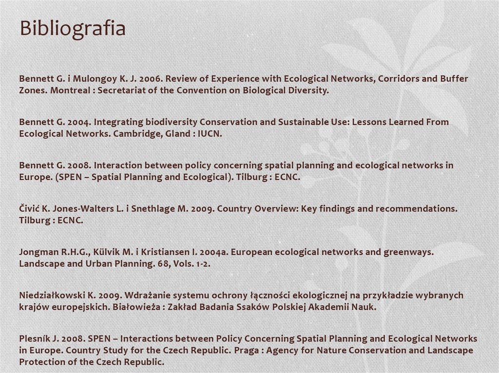 Bennett G. i Mulongoy K. J. 2006. Review of Experience with Ecological Networks, Corridors and BufferZones. Montreal : Secretariat of the Convention on Biological Diversity.